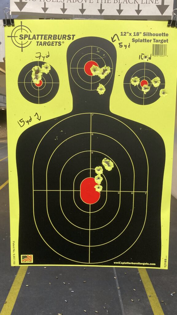 I then worked on a 12″x18″ SplatterBurst target. Did a big of dry fire at 5 yds, then shot different zones at different distances. These were also timed (one shot per beep). I’d say my groupings were okay and need to improve.