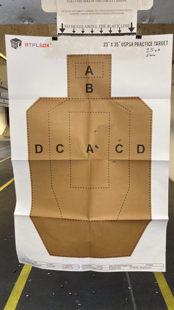 Started with dry fire, then repeated with live fire (slow, untimed). I got three rounds in the A-zone and two in C.