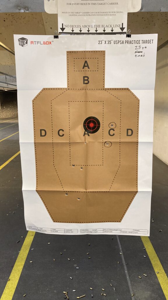 Today was the third Range Day of the year! I’m pumped! Two months ago, I could barely graze a full-sized paper target at 15 yds with a 9mm. But today I was able to land every shot inside the target at 25 yds, including three consecutive shots inside the A-Zone on a USPSA practice target.