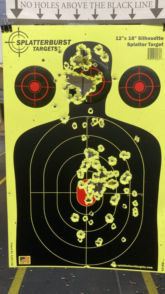 Basically, I kept repeating the drills I needed to work on, or tried new ones from the book for about 2 hours. Finally, to unwind, I magdumped my other firearms on another SplatterBurst target. All in all, I shot 200 rounds off my P365X-Macro. About 50 of those were slow (untimed) and the rest were timed.